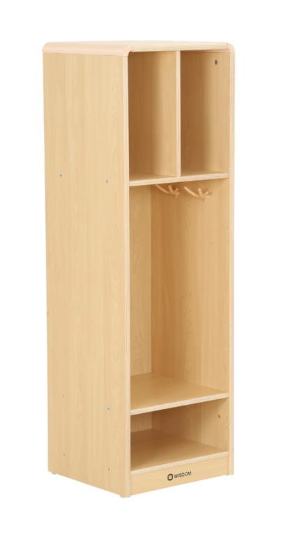 Ansprechende Ahorn-Optik / 2 Rucksackfächer / 1 Kleiderfach mit 4 Doppel-Kleiderhaken / 1 Schuhfach / Rückwand / Sockel