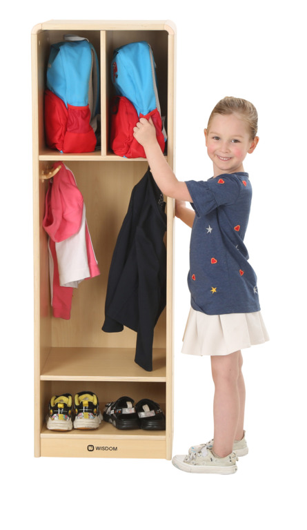 Die Doppelgarderobe OWLAF wurde speziell für den Einsatz in der Kinderbetreuung entworfen. Ihre moderne Form, die superstabile, langlebige Konstruktion und die Auswahl pflegeleichter und nachhaltiger Materialien werden den heutigen Anforderungen an Kindermöbeln in vollem Umfang gerecht. Die Garderobe ist zur Benutzung durch zwei Kinder ausgelegt, wobei jedes Kind über ein eigenes Rucksackfach verfügt, während das Kleider- und Schuhfach geteilt wird.