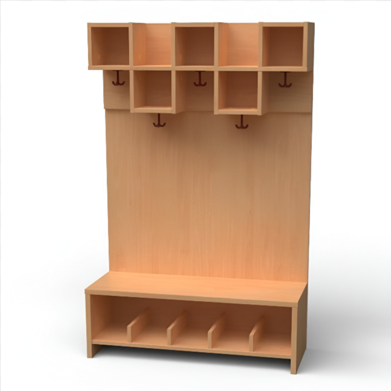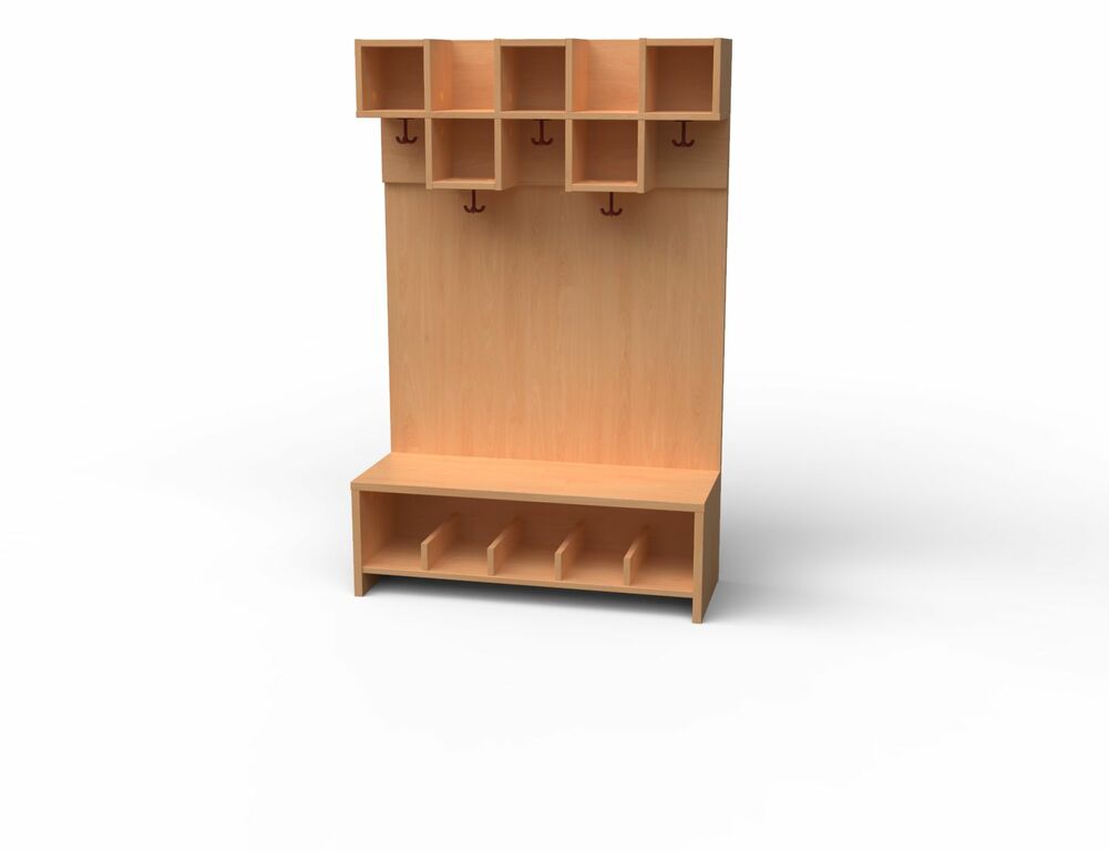 Garderoben-Set 5 Plätze. Stollenbauweise mit offenen Seutenteilen aus Bucke-dekor.