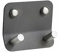 Garderobenhaken zur Wandbefestigung mit 2 Kleiderhaken. Die Grundform ist aus Eisen in Satin Grau (Matt); die beiden Haken sowie die Blindkappen für die Befestigungsschrauben sind aus Edelstahl.