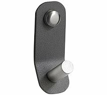 Garderobenhaken zur Wandbefestigung mit 2 Kleiderhaken. Die runde Form ist aus Eisen in Satin Grau (Matt); die beiden Haken sowie die Blindkappen für die Befestigungsschrauben sind aus Edelstahl.