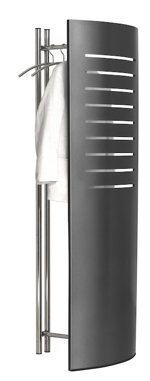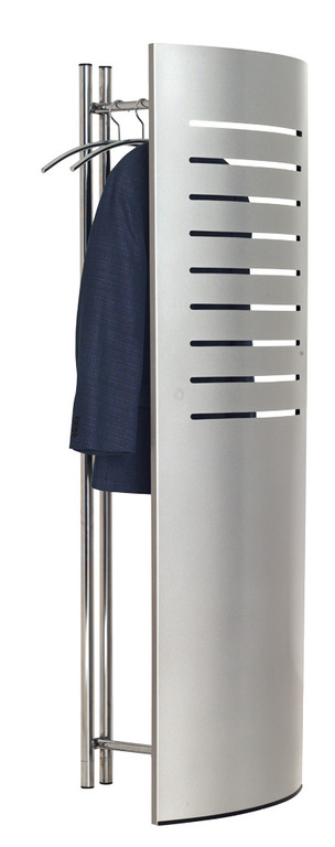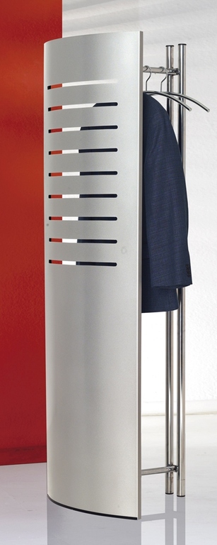 Die moderne und repräsentative Wandgarderobe ist sehr ansprechend und dekorativ. Das Sichtschutzpaneel aus pulverbeschichtetem Stahl etet einen interessanten Kontrast zu den elegant verchromten Standrohren, zur verchromten Kleiderstange und zu den verchromten Kleiderbügeln. Die obere Hälfte des Paneels ist mit Querschlitzen versehen, wodurch die Garderobe modern und leicht wirkt.