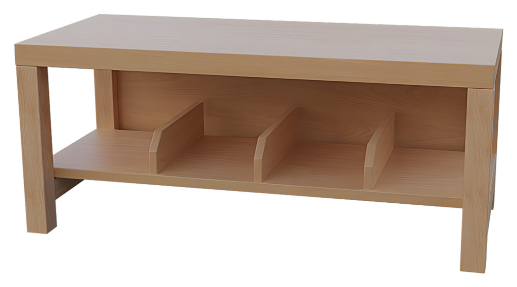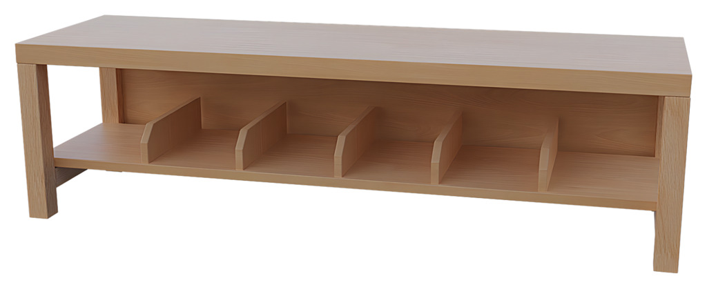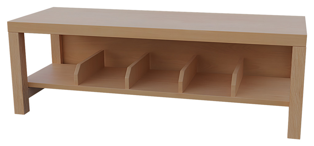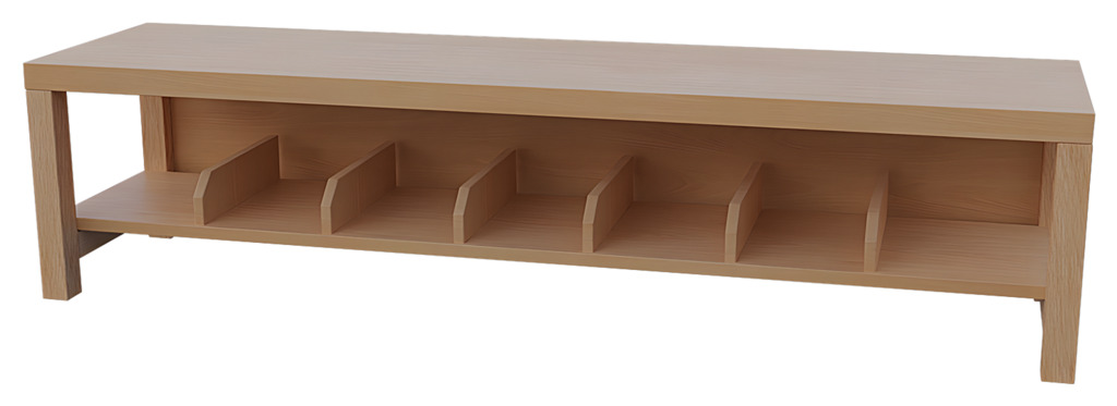 Die Garderobensitzbank "Eco-Line" mit Quadratstollen ist robust und in vier Breiten erhältlich. Die Ablage mit Unterteilungen bietet Platz für Schuhe.