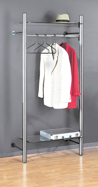 Das Garderobenelement besteht aus einer Anfangssäule, einer Kleiderbügelstange aus hochwertigem Edelstahl mit mattierter Oberfläche, einem Hut- und einem Ablageboden aus gehärtetem Einscheibensicherheitsglas.