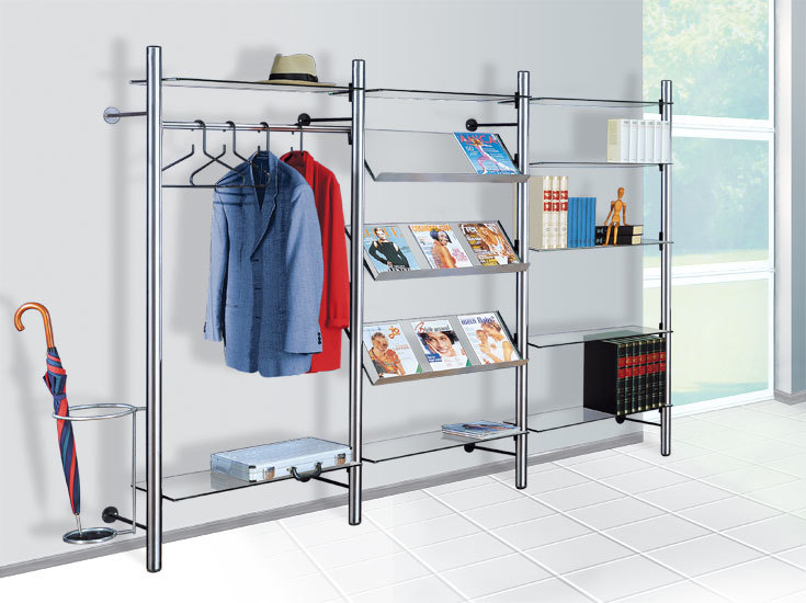 Das Garderobensystem Gloria aus gebürstetem/geschliffenem rostfreiem Edelstahl überzeugt durch das schlichte, elegante Design. Das Garderoben-, Regal- und Prospektelement sind jeweils einzeln verwendbar oder in beliebiger Zusammenstellung kombinierbar.
