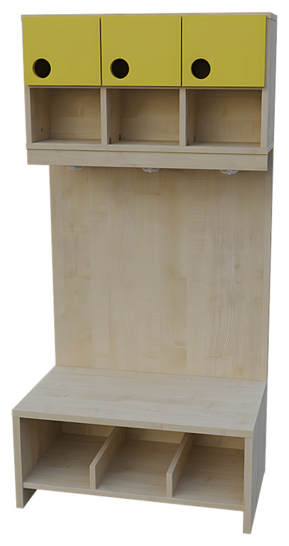 Das Garderobensystem "Modern-Line" beinhaltet verschiedene Bänke, Ablagen und Paneele zum Erstellen von individuellen Garderobeneinrichtungen. Die Türen der Garderobenablage und der Garderobenschränke sind in verschiedenen Farben wählbar, sodass ein individuelles und fröhliches Farbkonzept realisiert werden kann. Mit Garderobenbänken und Ablagen für Innenecken ist es auch problemlos möglich, die Garderobenanlage über eine Ecke fortzuführen. Schließlich gibt es auch noch komplette Garderoben-Sets "Modern-Line" in verschiedenen Variationen.