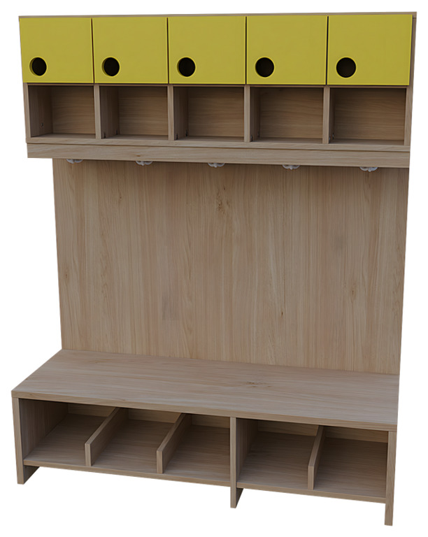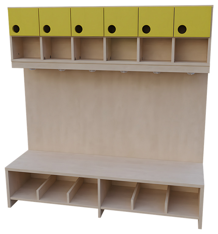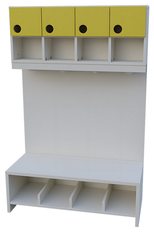Das Garderobensystem "Modern-Line" beinhaltet verschiedene Bänke, Ablagen und Paneele zum Erstellen von individuellen Garderobeneinrichtungen. Die Türen der Garderobenablage und der Garderobenschränke sind in verschiedenen Farben wählbar, sodass ein individuelles und fröhliches Farbkonzept realisiert werden kann. Mit Garderobenbänken und Ablagen für Innenecken ist es auch problemlos möglich, die Garderobenanlage über eine Ecke fortzuführen. Schließlich gibt es auch noch komplette Garderoben-Sets "Modern-Line" in verschiedenen Variationen.