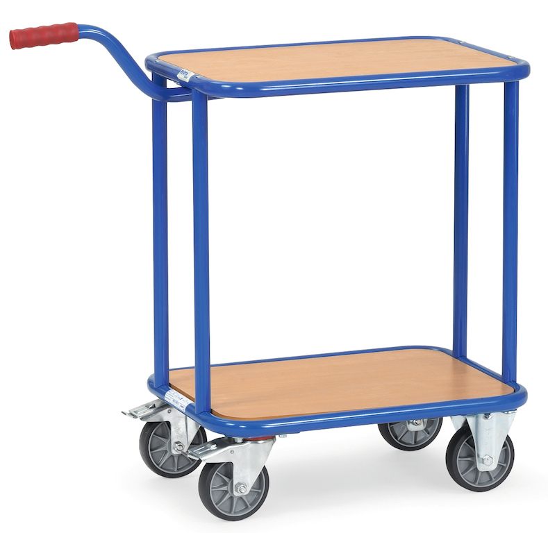 Der Griffroller mit Einhandbedienung ist für den schnellen Transport von Gegenständen mit einem Gewicht von bis zu 250 kg geeignet. Er ist aus einer gefälligen Stahlrohrkonstruktion mit Pulverbeschichtung gefertigt. Die beiden Plattformen bestehen aus in Rohrstrebenrahmen liegenden Holzwerkstoffplatten, Oberfläche in Buchendekor, der Griff ist anschraubbar.