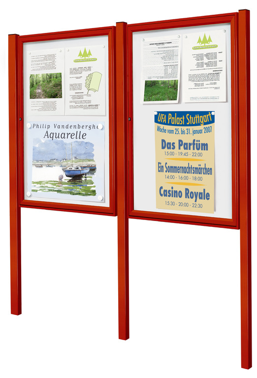 - Befestigung: Lieferung ohne Schrauben. Montage der Schrauben an Schaukasten bei Wandmontage oder an die Pfosten 60 x 40 mm.