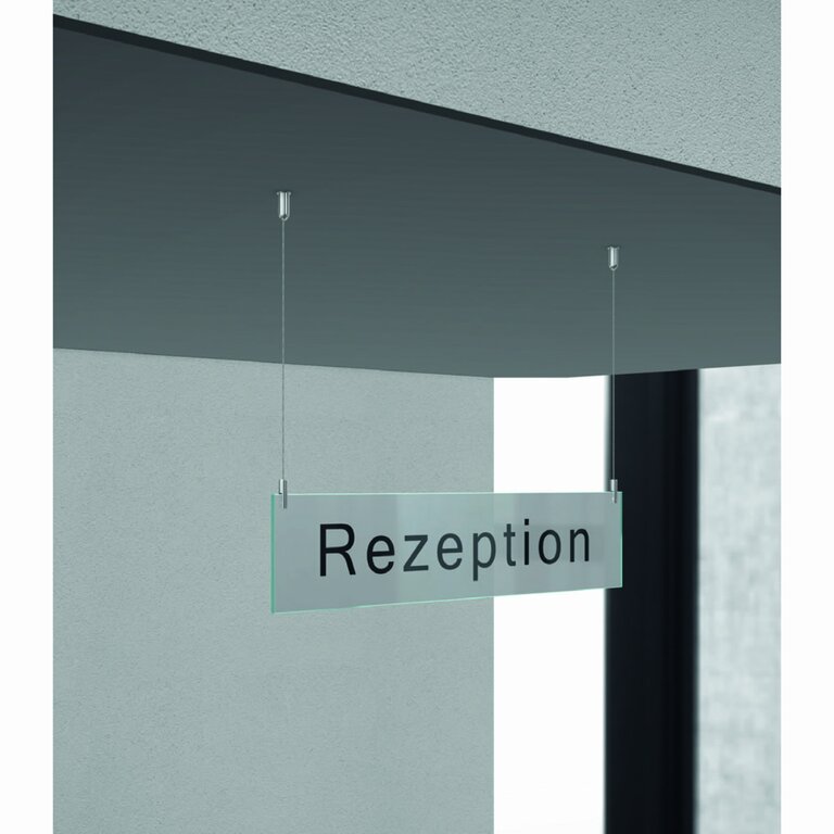 Das Grundmodell „Deckenmontage“ besteht aus je 2 Deckenstücken und Schilderbefestigungen, 2 x 1000 mm Edelstahlseil sowie - je nach Ausführung - 1 bzw. 2 Glasscheiben (thermisch gehärtet, 5 mm stark) im gewählten Format. Diese weisen zwei bzw. vier Bohrungen auf, je nachdem, ob eine Erweiterungsscheibe gewählt wird oder nicht.