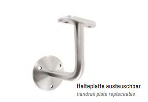 Hochwertige Handlaufhalter in V2A-Edelstahl oder V4A-Edelstahl. Das Rondenmaß beträgt bei V2A-Edelstahl 58 x 4 mm, bei V4A-Edelstahl 70 x 5 mm in gewölbter Ausführung. Die Ronden haben jeweils 3 x 6,5 mm Bohrungen. Der Bügel hat bei V2A-Edelstahl einen Durchmesser von 12 mm, bei V4A-Edelstahl 14 mm und ist mit der Ronde verschraubt. Nach oben ist der Bügel mit einer austauschbaren Halteplatte ausgestattet. Der Wandabstand bis Mitte-Bügel beträgt 85 mm.