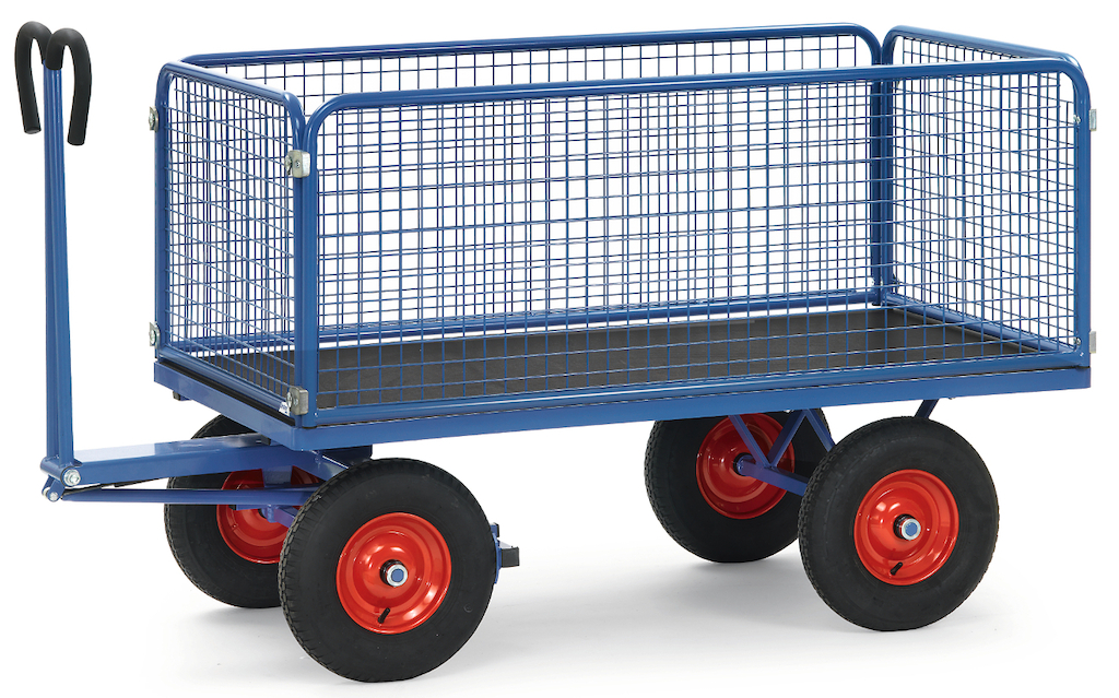 Der Handpritschenwagen ist im Baukastensystem in sauber geschweißter Stahlrohr- und Profilstahl-Konstruktion mit hochwertiger Pulverbeschichtung gefertigt. Die Ladefläche ist mit einer rutschsicheren Siebdruckplatte aus wasserfestem Sperrholz belegt, die Wände mit nachstellbaren Kastenverschlüssen bestehen aus Stahlrohrrahmen mit eingeschweißtem Drahtgitter. Die Stirnwände sind mit der Plattform verschraubt, die Längswände lassen sich herausnehmen bzw. einhängen. Der Wagen ist mit einer Drehschemel-Lenkung mit Kugelkranz und automatischer, auf die Vorderräder wirkender Feststellbremse ausgestattet, die Scherendeichsel mit Sicherheits-Handgriff mit hautsympathischem Softgrip-Bezug und automatischer, gedämpfter Rückstellung in Ruheposition.