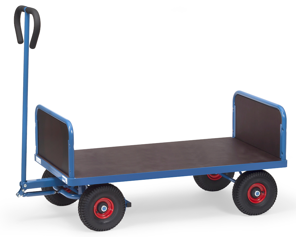 Der 2-achsige Handwagen in sauber verschweißter Stahlrohr- und Profilstahl-Konstruktion mit hochwertiger Pulverbeschichtung ist mit einer Drehschemel-Lenkung mit Sicherheitsdeichsel (automatische gedämpfte Rückstellung in Ruheposition) und Handgriff ausgestattet.