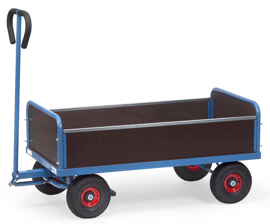 Die Ladefläche und die Einstecklängswände aus rutschsicherer, wasserfester Siebdruckplatte liegen in einem Profilstahlrahmen, die Stirnwände sind mit Stahlrohr eingefasst. Der Sicherheitshandgriff an der Deichsel ist mit einem hautsympathischen Softgripbezug ausgestattet.