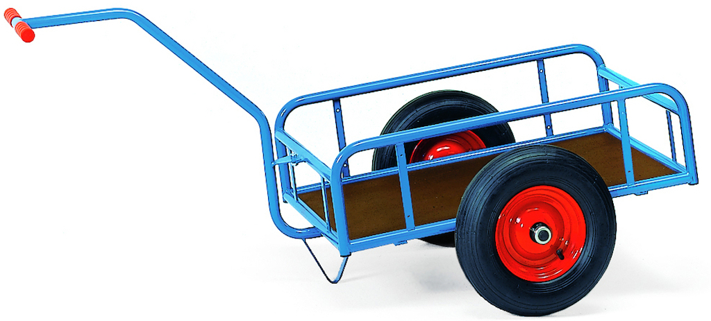 Der 1-achsige Handwagen in sauber verschweißter Stahlrohr-/Profilstahl-Konstruktion mit hochwertiger Pulverbeschichtung ist mit einer Ladefläche aus rutschsicherer, wasserfester Siebdruckplatte ausgestattet. Das Geländer ist 250 mm hoch. Die Deichsel ist an- und abschraubbar und im Griffbereich mit ergonomischen roten Überzügen versehen.