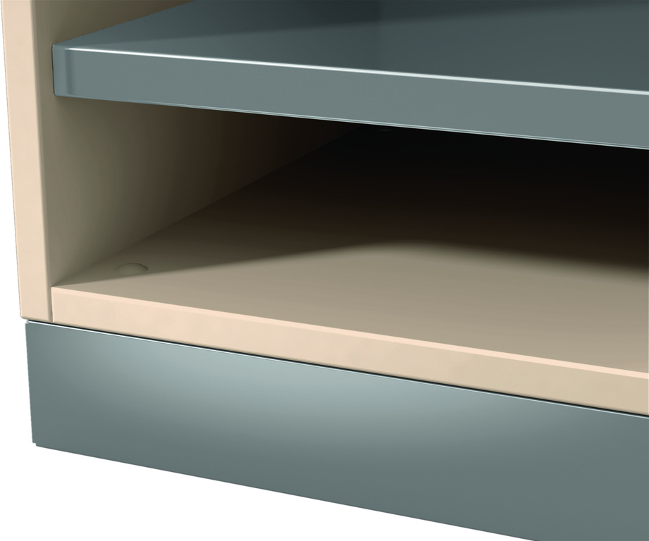 - Sockelausklinkung rückseitig bei Holzsockel. Dadurch kann der Schrank trotz Wandleiste (H x T max. 78 x 38 mm) wandbündig aufgestellt werden