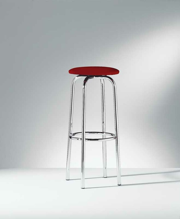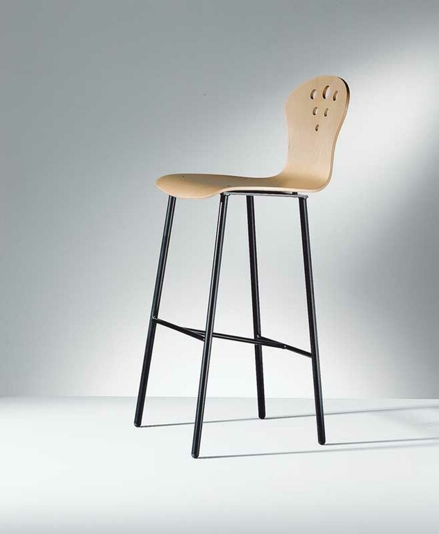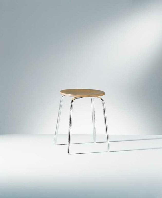 Hocker, Gestell aus Stahl-Rundrohr, verchromt oder pulverbeschichtet, Sitzplatte bzw. Sitzschale aus Buchenschichtholz, natur lackiert oder gebeizt nach Hauskollektion.