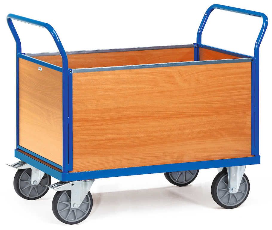 Der Vierwandwagen besteht aus dem Multivario-Basiswagen mit im Profilrahmen liegender Plattform, die mit drei Oberflächenbelägen wählbar ist, zwei Stirnwänden und zwei Längswanden aus im Profilrahmen liegenden Platten aus Holzwerkstoff (Stirnwände mit Stahlrohr-Schiebebügeln). Ein leistungsstarker Elektroantrieb und Zusatzausstattung sind optional erhältlich. Zubehör wie Drehschemel-Lenkung (Anbausatz), Softgrip, Drahtkorb, Schreibtafel und Scannerhalter bitte separat bestellen.