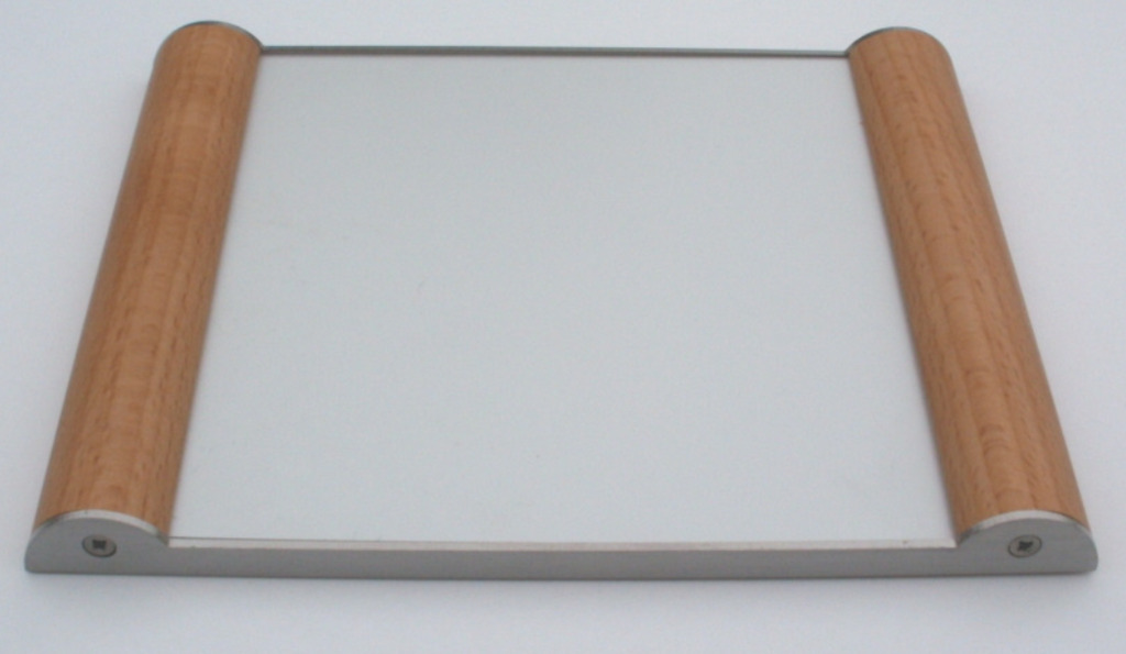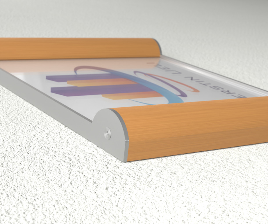 Grundplatte mit runden, 27 mm breiten Seitenprofilen aus Echtholz. Oben und unten mit 2 mm gelaserten Edelstahlabschlüssen. Beschriftungsträger aus weißem Karton 160 mm/m². Transparente Schutzabdeckung aus Polycarbonat.