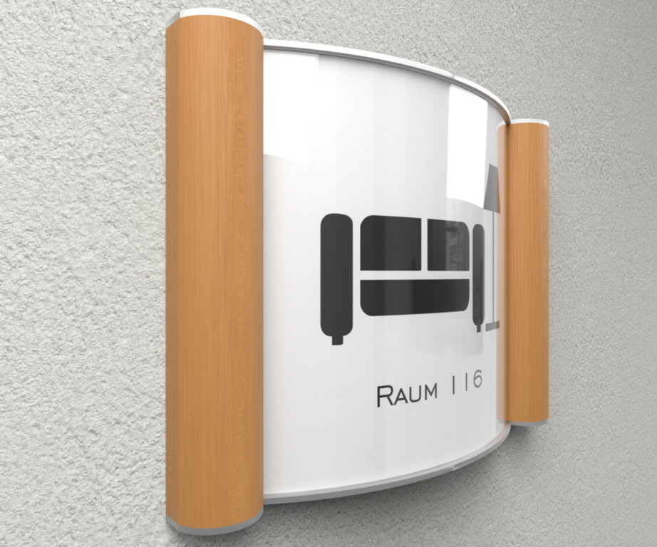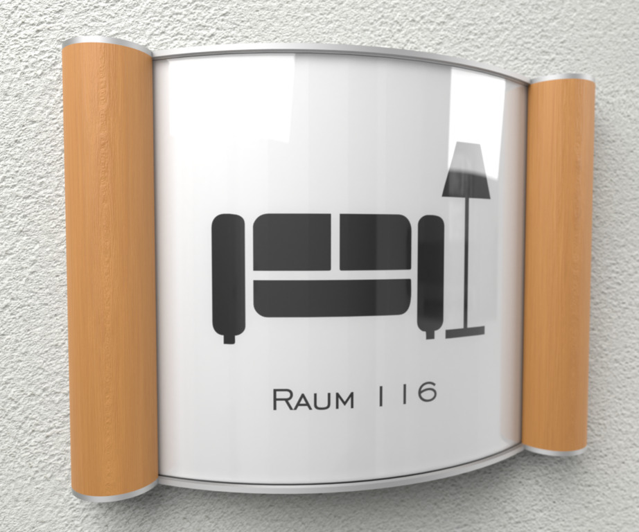 Bei unserem besonders hochwertigen Türschild Wien sind die Materialien Massivholz und Edelstahl auf einmalige Art und Weise mit der funktionalen Technik eines modernen Beschilderungssystems kombiniert. Das konvex geschwungene, markante Design ist schlicht und dennoch edel und eignet sich daher bestens für Objekte wie Bürohäuser, Krankenhäuser, Behörden oder Universitäten. Die Beschriftung lässt sich ganz individuell gestalten, sodass firmen- oder hauseigene Farben, Logos und Schriftzüge realisiert werden können.