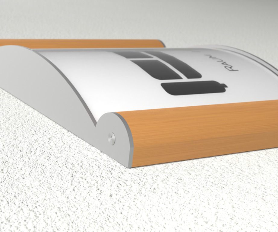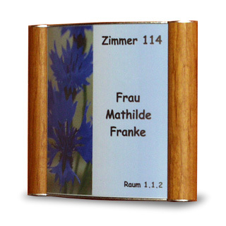 Grundplatte mit runden, 2,7 mm breiten Seitenprofilen aus Echtholz. Oben und unten mit 2 mm gelaserten Edelstahlabschlüssen. Beschriftungsträger aus weißem Karton 160 mm/m². Konvex gewölbte, transparente Schutzabdeckung aus Polycarbonat.