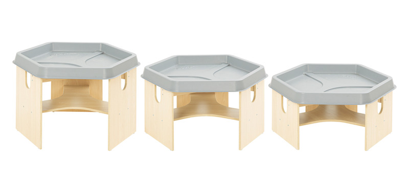 3 Spieltische in ansprechender Ahorn-Optik / Materialschalen aus PP / Ablagefläche unter der Materialschale