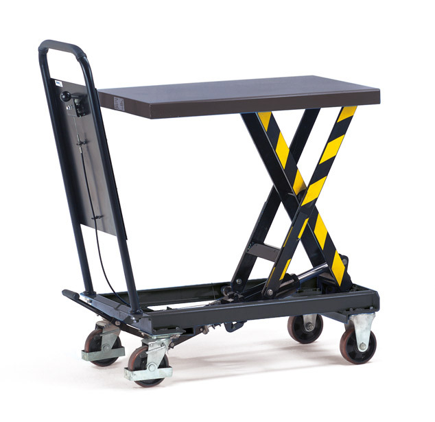 Der Hubtischwagen ist in stabiler Profilstahl-/Stahlblech-Konstruktion mit hochwertiger Pulverbeschichtung gefertigt. Die Ausstattung besteht aus einem kräftigen Rohrschiebebügel und einer Hydraulikpumpe mit verchromtem Kolben (Bedienung über Fußpedal, Senkventil über Handhebel feinfühlig zu betätigen).