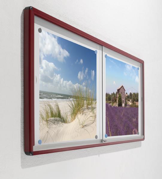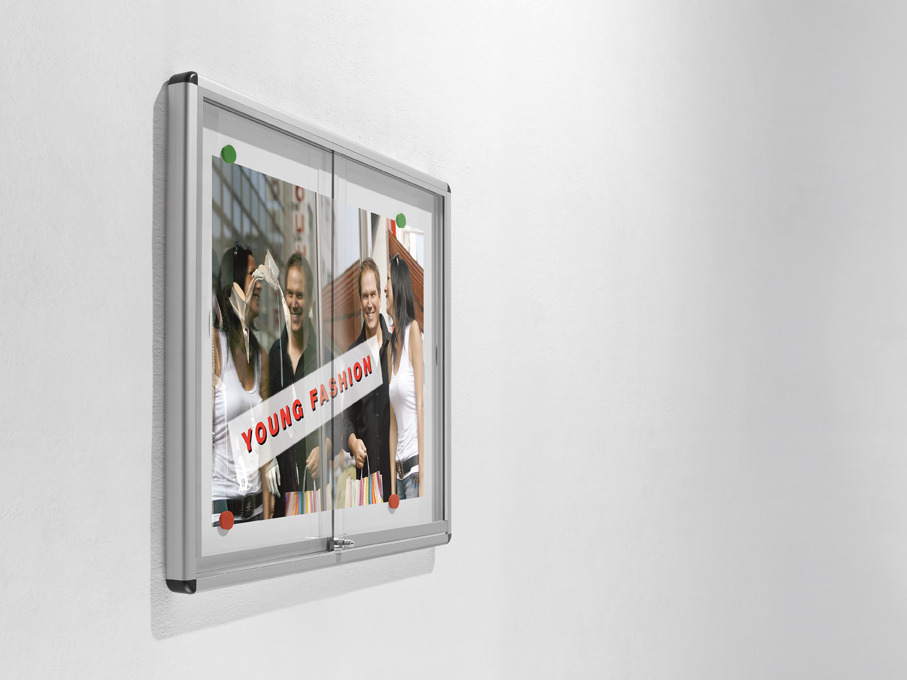 Unsere Informationsvitrine V10A zu Wandmontage ist mit ihren 2 Schiebetüren aus Sicherheitsglas super geeignet, um wichtige Informationen oder Bilder auszustellen. Sie ist dank Druckzylinderschloss verschließbar und hat eine Whiteboardoberfläche als Rückwand.