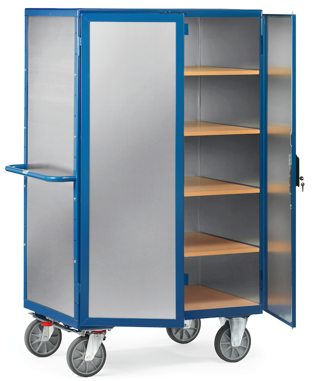 Der Blechkastenwagen in stabiler Schweißkonstruktion aus Winkelstahl mit hochwertiger Pulverbeschichtung eignet sich für alles, was sicher transportiert und aufbewahrt werden soll. Die Wände, das Dach und die Doppelflügeltür bestehen aus in Winkelstahlrahmen eingeschweißten, mit 1,5 mm starkem Alublech verkleideten Stahlblechen. Die Türen sind durch den Treibriegelverschluss mit Schwenkhebel und eingebautem Zylinderschloss abschließbar. Der Boden aus Holzwerkstoffplatte mit Oberfläche in Buchendekor liegt in einem Rahmen aus Winkelstahl. Die Einlegeböden aus tragfähigen, biegesteifen Sandwichplatten sind an den Kanten mit PVC-Umleimer eingefasst und liegen auf Bodenträgern auf, die im Raster von 100 mm variabel einsetzbar sind. Weitere Einlegeböden können zusätzlich bestellt werden. Der Schiebegriff besteht aus Stahlrohr. Als Zubehör ist ein Scannerhalter erhältlich.