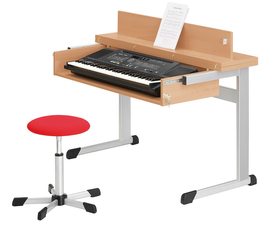 Funktionaler Keyboardtisch mit aufklappbarer Tischplatte und auszieh- sowie verschließbarem Keyboardfach, der sich kinderleicht in einen Schüler- oder Lehrertisch verwandeln lässt. Der Keyboardtisch ist gegen Mehpreis auch in höhenverstellbarer Ausführung erhältlich.