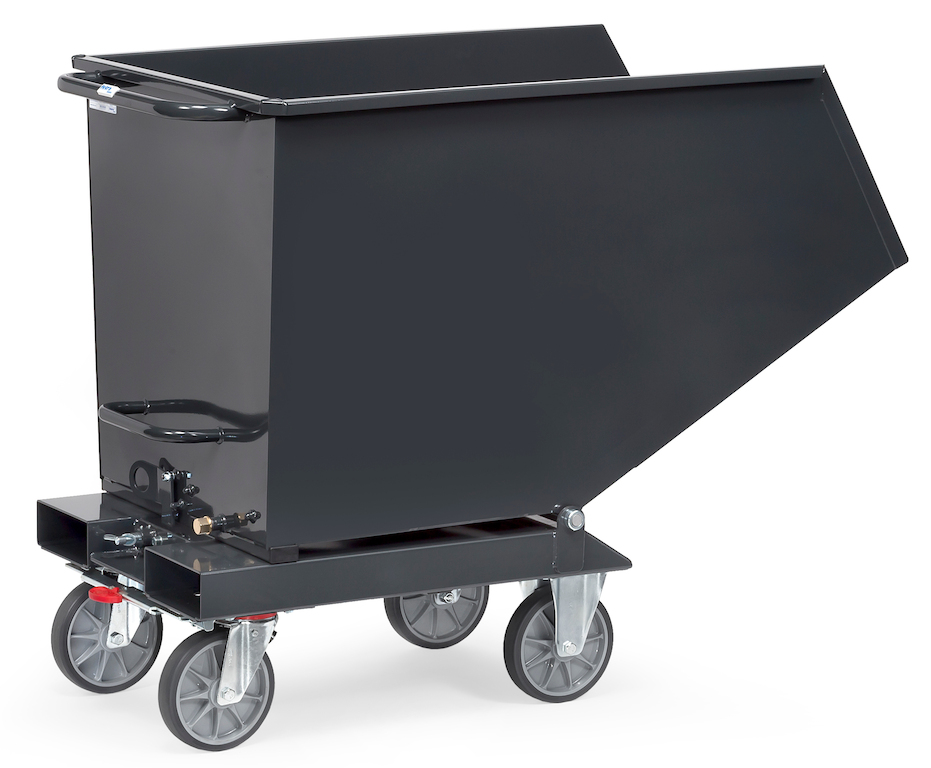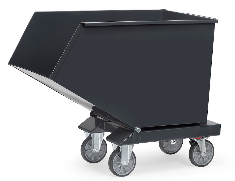 Der Muldenkipper ist sowohl für den fahrbaren Einsatz als auch für den Staplerbetrieb geeignet. Der Kippvorgang wird manuell ausgelöst. Für die Entleerung mit dem Gabelstapler oder bei schwerer Beladung empfehlen wir einen Kippbehälter oder einen Selbstkipper.