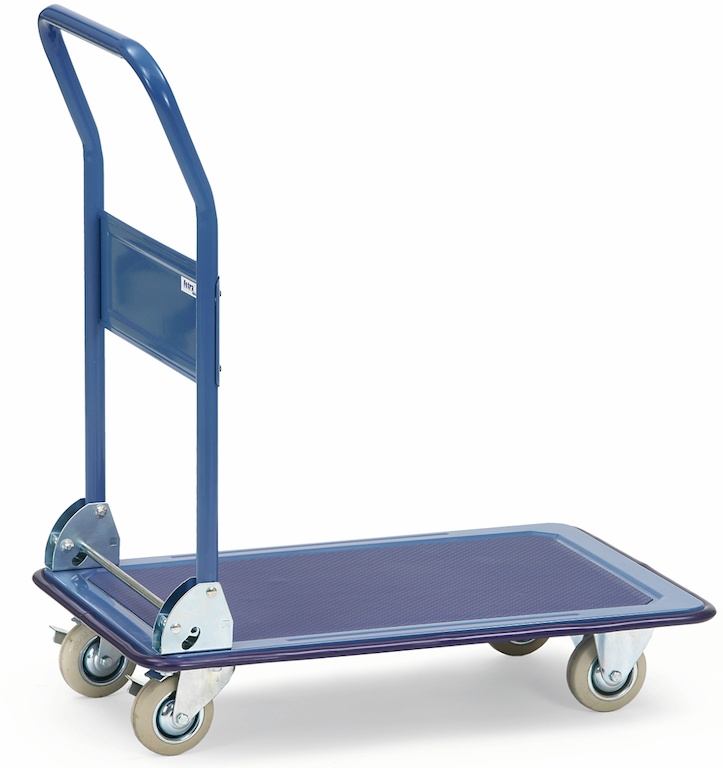 Die Plattformwagen hat eine geschlossene Ladefläche aus gepresstem Stahlblech mit aufgeklebtem Antirutschbelag und einer umlaufenden Schutzleiste. Der klappbare Rohrschiebebügel ist mit einem kräftigen, glanzverzinkten Klappbeschlag und einer breiten Querstrebe ausgestattet.