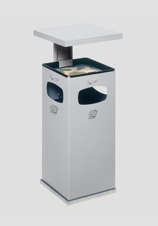 Gefertigt aus geschliffenem Edelstahl, mit drei Einwurföffnungen. Das verstärkte Dach wird mit einem Schloss (Vierkant-Schlüssel) verriegelt und ist gleichzeitig Diebstahlsicherung für den Aschereinsatz (Edelstahl) und das Kippensieb. Der feuerverzinkte Standrahmen wird mit dem Gerätekorpus verbunden und kann zur Sicherung mittels beiliegendem Montagematerial fest auf dem Boden montiert werden.