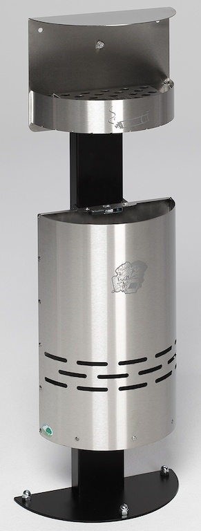 Diese Ascher/Abfallsammler-Kombination H 98 ist gefertigt aus matt geschliefenem Edelstahl. Mit kombiniertem Ascher (Inhalt ca. 1,5l) mit Lochblecheinsatz, ebenfalls aus Edelstahl, zur praktischen Entleerung herausnehmbar. Verriegelt mit Vierkantschloss (1 Schlüssel) und mit Wetterschutzdach. Abfallkorb aus Edelstahl, Inhalt ca. 13 l. Lieferung inkl. schwarz pulverbeschichtetem Standfuß und Montagematerial zur Bodenbefestigung.