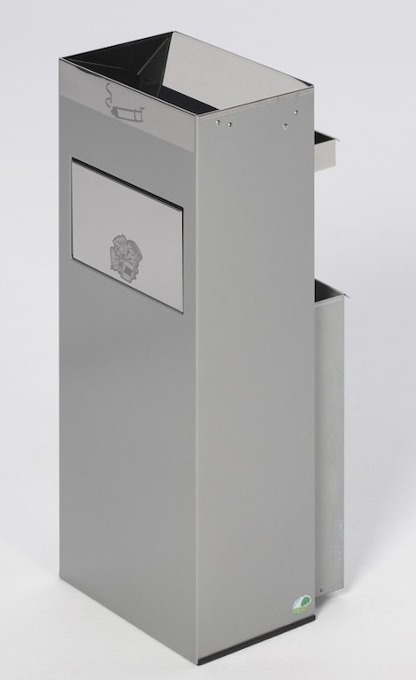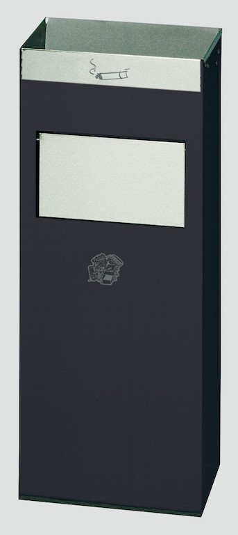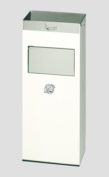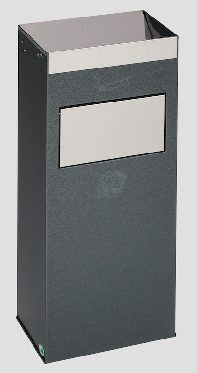 Gefertigt aus verzinkten Stahlblechen und – für einen optimalen Oberflächenschutz – Pulverbeschichtung auf Polyester-Basis. Ausgerüstet mit Einwurfblenden und Einwurfklappe aus poliertem Edelstahl. Für eine getrennte Aufnahme von Asche und Abfall befinden sich zwei entnehmbare Einsätze aus verzinktem Stahlblech im Gerät. Leichtes Reinigen der Einsätze. (Rückwand offen.) Mit bodenschonendem Kantenschutz.