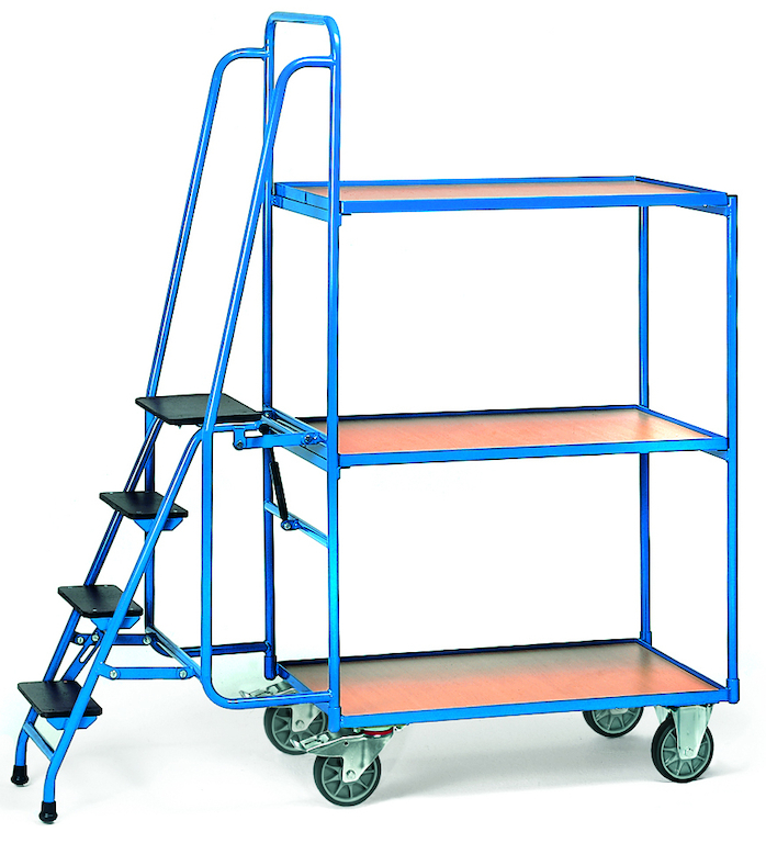 Die drei Plattformen aus Holzwerkstoff mit Oberfläche in Buchendekor liegen im Winkelstahlrahmen mit 12 mm hohem Rand. Die offenen Stirnwände sind Stahlrohrrahmen, an einer Seite sind Trittstufen aus Holz angebracht, die sich im unbelasteten Zustand selbsttätig anheben und bei Belastung wieder sicher auf dem Boden stehen und dadurch den Wagen automatisch blockieren. Zum Festhalten und Anlehnen sind Sicherheitsbügel angeschweißt. Die Leiter lässt sich bei Nichtgebrauch anklappen. Als Zubehör ist ein Scannerhalter und eine Schreibtafel erhältlich.