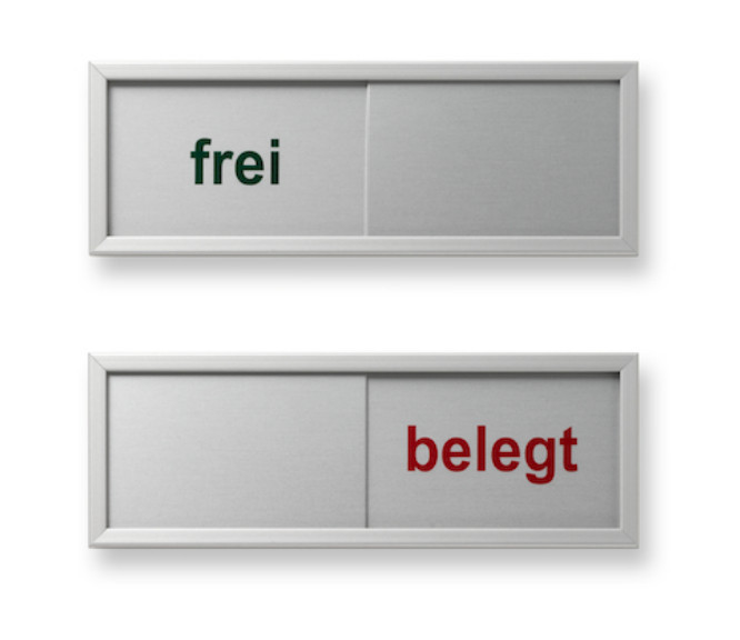 Durch den besonders schmalen Aluminiumrahmen und das schmale Format wirkt das Funktionsschild FL filigran und sehr modern. Der Schieber für die "frei/belegt"-Anzeige wird manuell bedient.