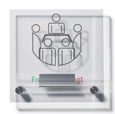 Bestehend aus einer glasklarem Acrylglasscheibe, Stärke 4 mm, Kanten poliert. Mit Piktogramm und Schieber zur Anzeige der Raumbelegung.