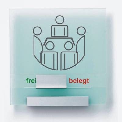 Das Funktionsschild M ist mit einem Montagehalterung aus Aluminium am unteren Rand des Schildes ausgestattet. Die Fläche aus bruchfestem Acrylglas ist wahlweise in grünlich opaker, bläulich opaker, weiß opaker oder glasklarer Ausführung erhältlich. Der Schieber für die "frei/belegt"-Anzeige wird manuell bedient, das aufgedruckte Piktogramm ist inklusive.