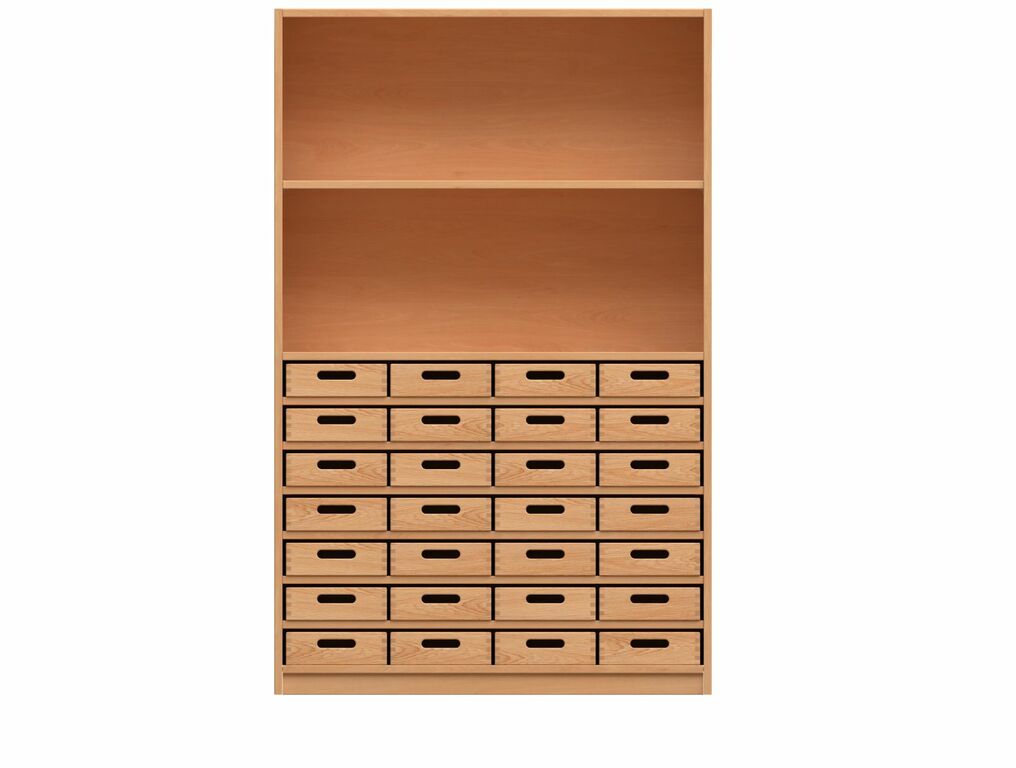 - Oben: Offen, 1 Fachboden. Unten: Offen, 6 Fachböden, 7 x 4 Materialkästen