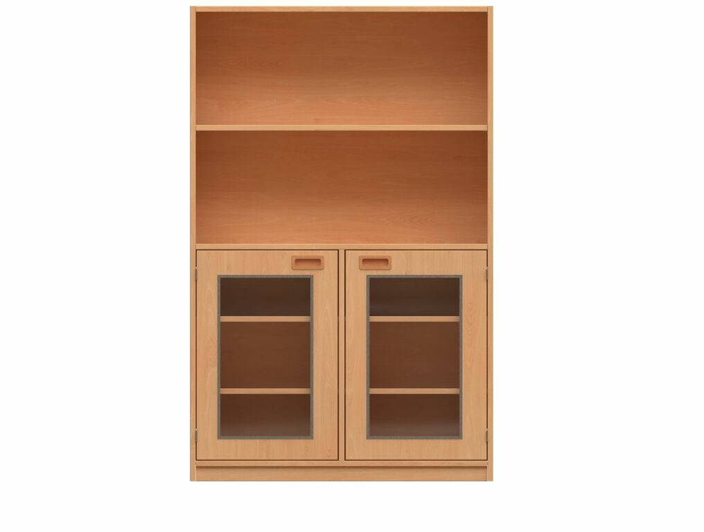 - Oben: Offen, 1 Fachboden. Unten: Mit 2 Türen,mit Glasausschnitt, Muschelgriffe, Mittelwand 2x2 Fachböden
