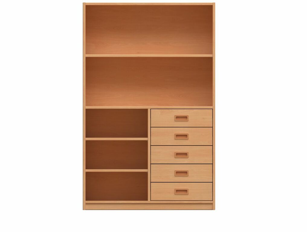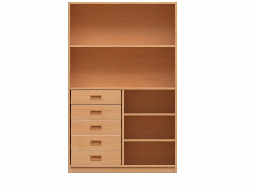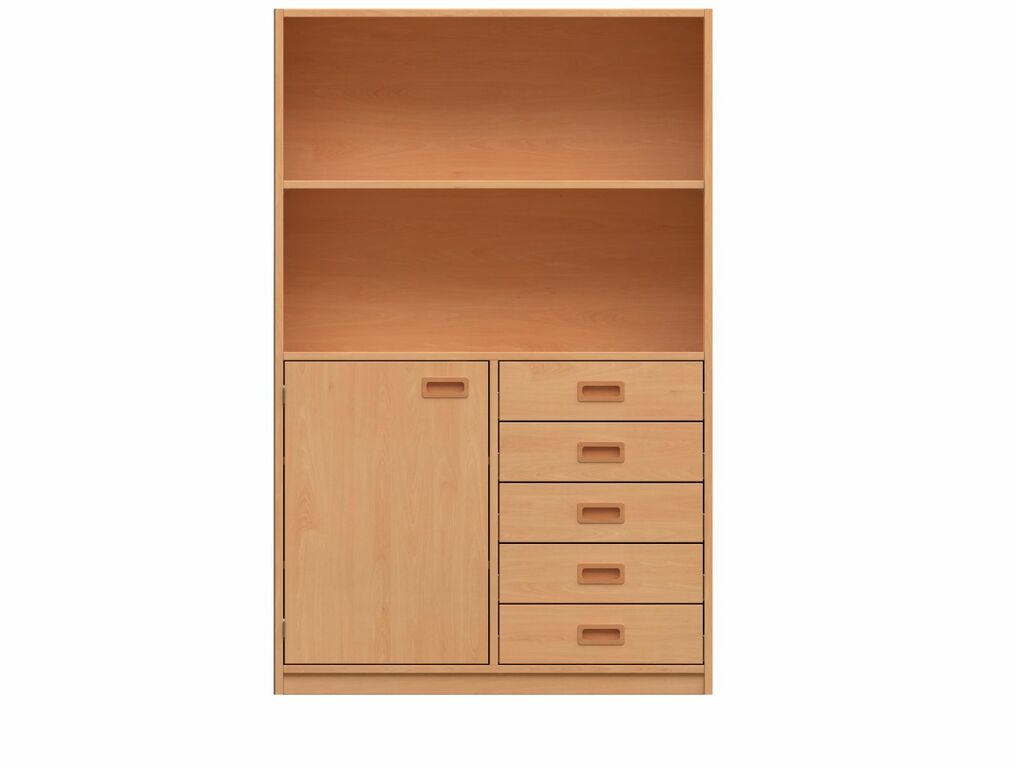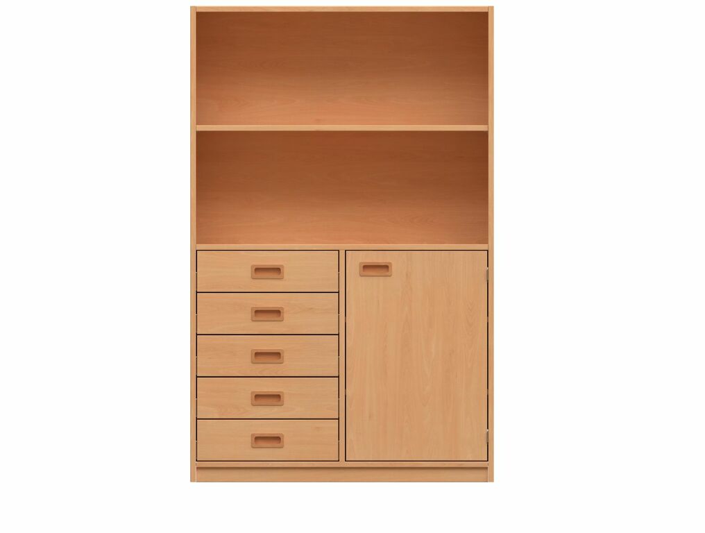 - Oben: Offen, 1 Fachboden. Unten: Offen, 3 Fachböden, 4 x 4 Materialkästen