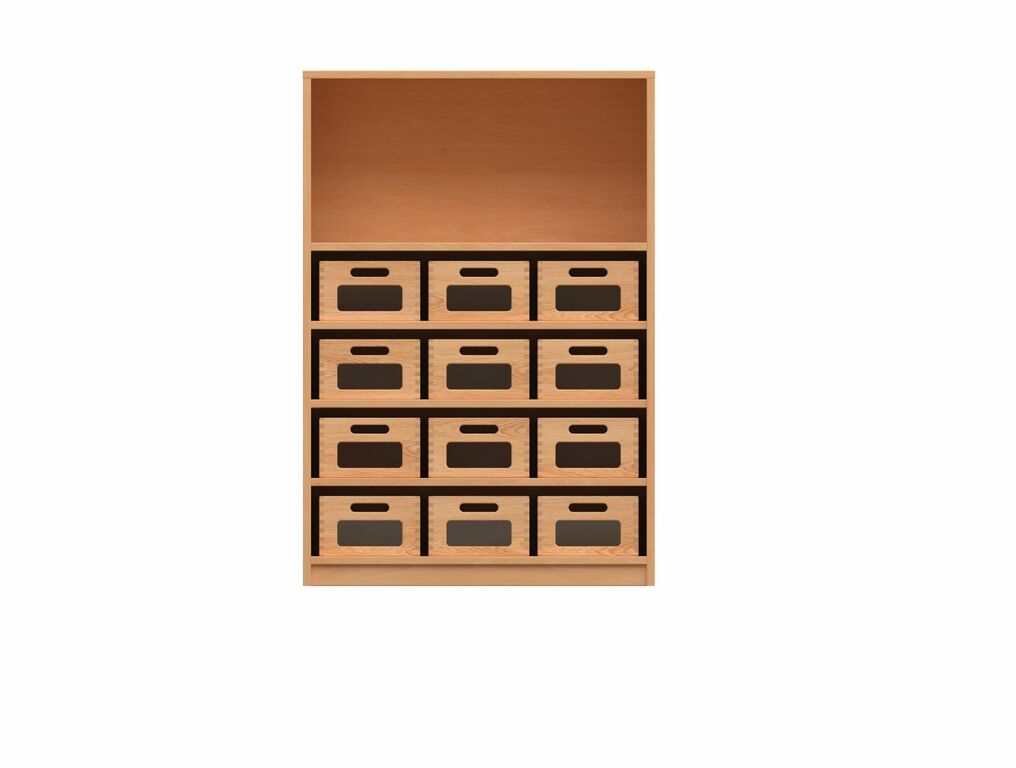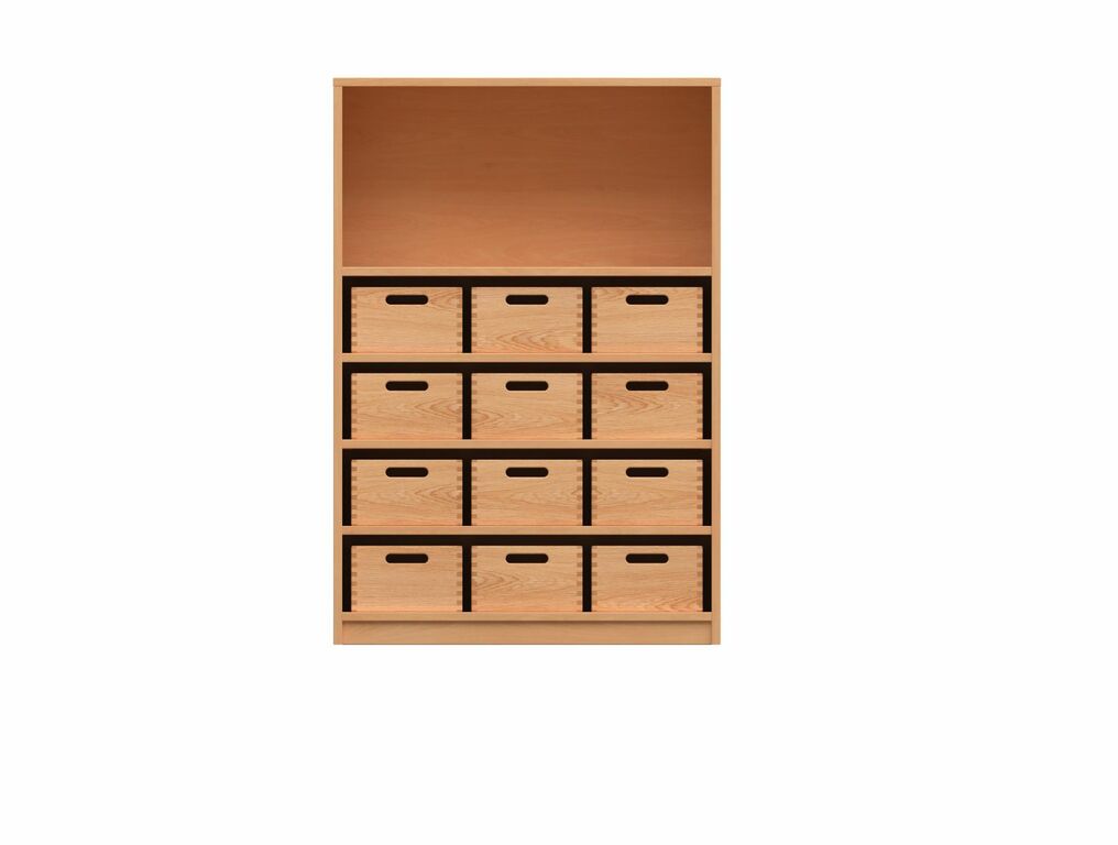 - Oben: Offen, 1 Fester Fachboden 3 Fachböden, 4 x 3 Materialkästen