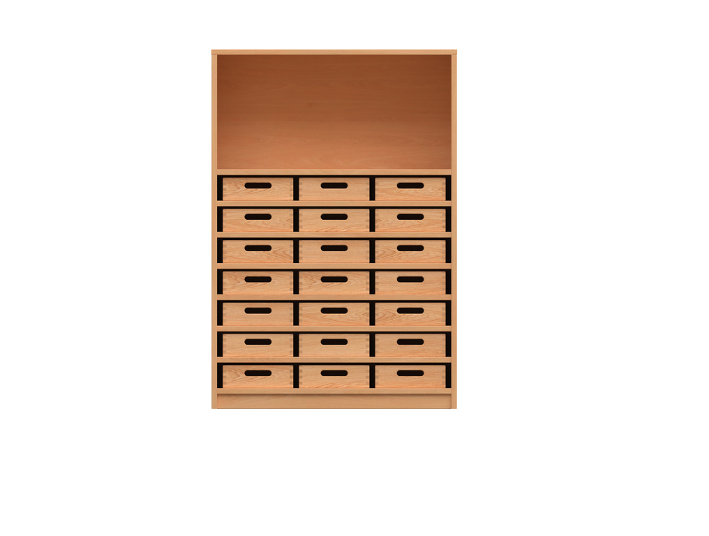 - Oben: Offer, 1 Fester Fachboden Unten: Offen, 6 Fachböden, 3 x 7 Materialkästen