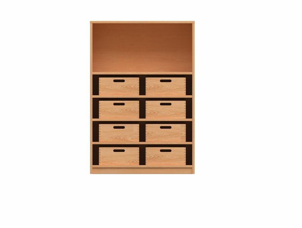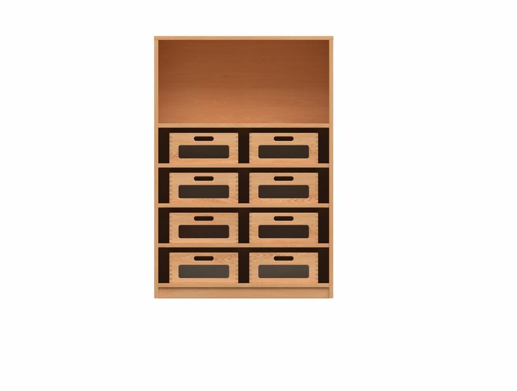 - Oben: Offen, 1 Fester Fachboden Unten: Offen, 3 Fachböden, 2 x 4 Materialkästen