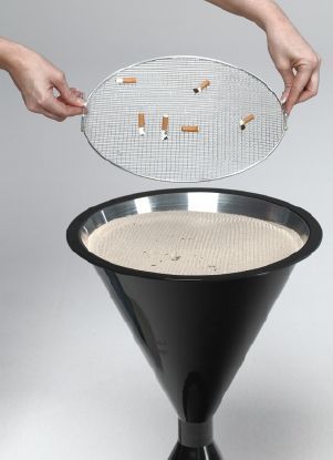 Zweiteilige Konstruktion (Einfache Selbstmontage, ohne Werkzeug). Hohe Standfestigkeit durch Zusatzgewicht im Bodenteil. Lieferung inkl. verzinktem Kippensieb und Einlegeteil aus Kunststoff zur Sandreduzierung. Sandbedarf pro Füllung ca. 6 kg.