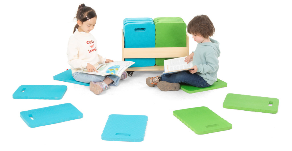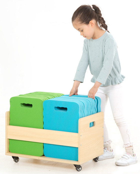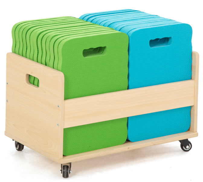 Der Sitzkissenwagen mit 4 stabilen Lenkrollen aus Stahl mit Gummi-Bereifung enthält 28 bequeme Sitzkissen, die mit großen Grifföffnungen ausgestattet sind. Sie eignen sich perfekt für Morgenkreise, Erzählstunden und alle Gelegenheiten, die schnell und einfach eine größere Anzahl von Sitzgelegenheiten erfordern. Auch für Outdoor-Veranstaltungen können sie verwendet werden, um Feuchtigkeit und Schmutz fernzuhalten, während man darauf sitzt.