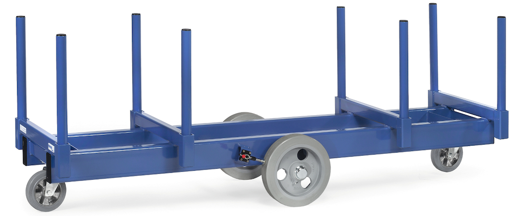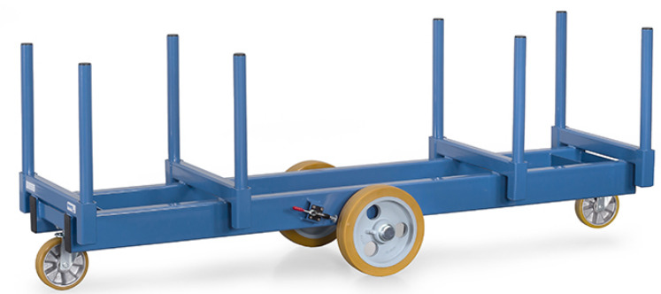 Der Langmaterialwagen ist in solider Profilstahl-Schweißkonstruktion mit hochwertiger Pulverbeschichtung gefertigt und mit 8 einsteckbaren Stahlrohrrungen und 2 Materialmulden ausgestattet. Die Mitte ist frei für Kran- oder Stapler-Beladung.