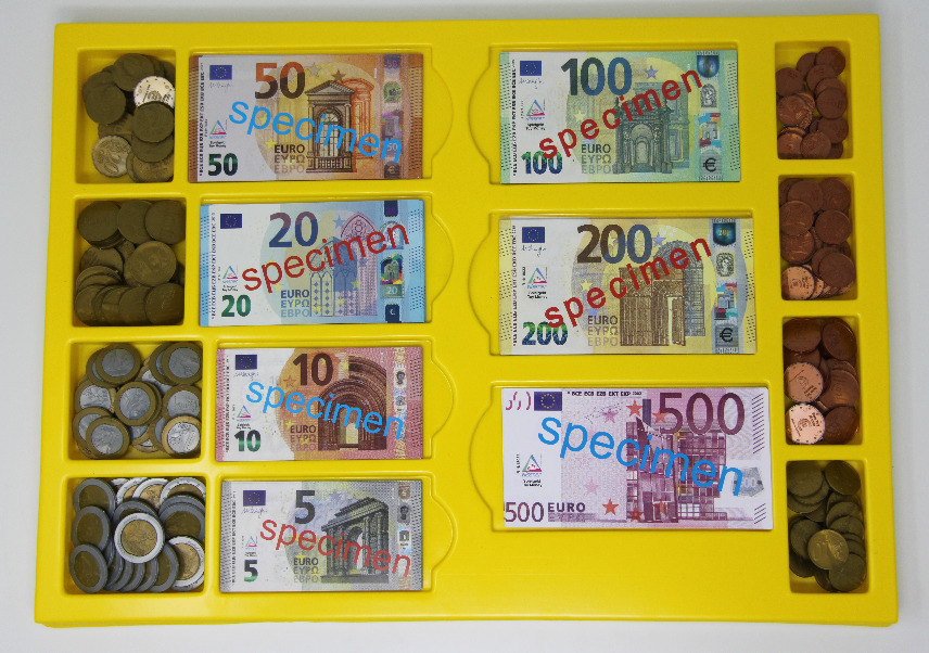 Die Geldkassett (60 x 24 x 2 cm) ist aus Kunststoff und hat einen Deckel. Dieser Satz enthält 130 Scheine und 160 Münzen.