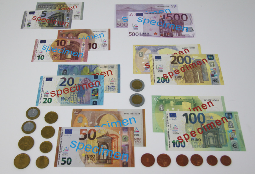 Satz aus 22 Scheinen (5 x 5, 5 x 10, 3 x 20, 3 x 50, 2 x 100, 2 x 200, 2 x 500 Euro) aus verstärktem Papier und 22 Münzen (5 x 1, 2 x 2, 2 x 5, 2 x 10, 2 x 20, 2 x 50 Cent, 5 x 1 und 2 x 2 Euro) aus Kunststoff.